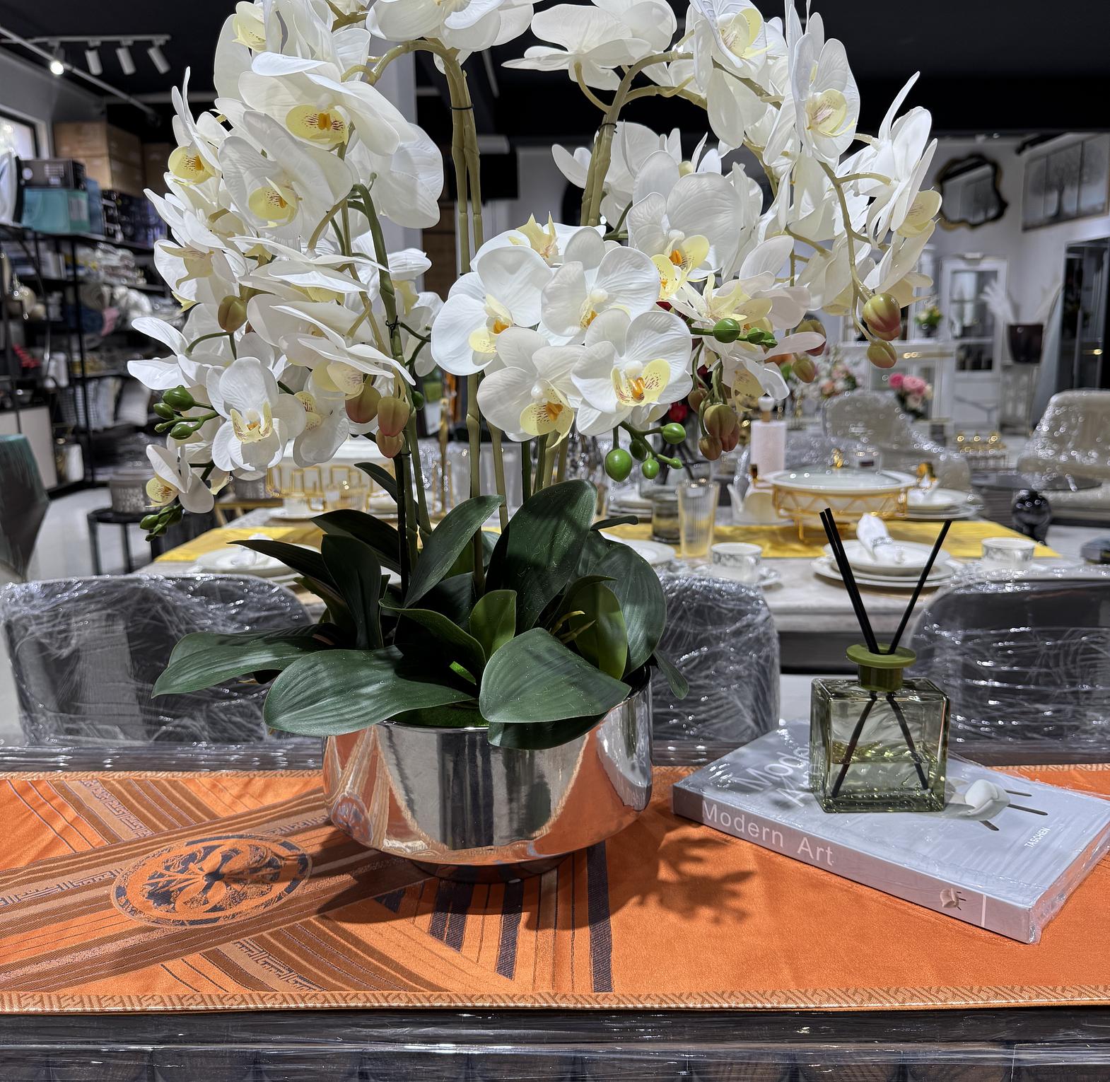 Elevate your space with this elegant White Orchid arrangement, designed to bring timeless beauty and sophistication into any interior. Featuring delicate butterfly-shaped blooms with soft yellow centers and lush green leaves, this statement piece adds a refined, modern touch to your decor.
