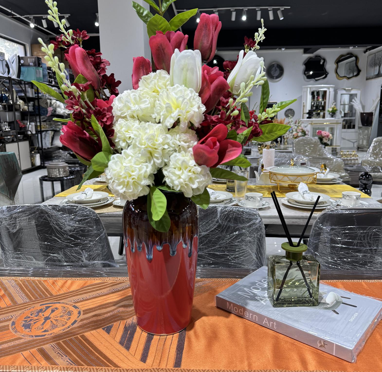 Add timeless beauty to your space with this stunning floral arrangement featuring vibrant red and white tulips paired with full, soft white hydrangeas. Designed with lush green foliage and set in a stylish decorative vase, this arrangement brings a touch of sophistication and warmth to any room, Perfect for Living room centerpieces, Dining table decor,Dining table decor, Gifts for special occasions, Home and event decoration.