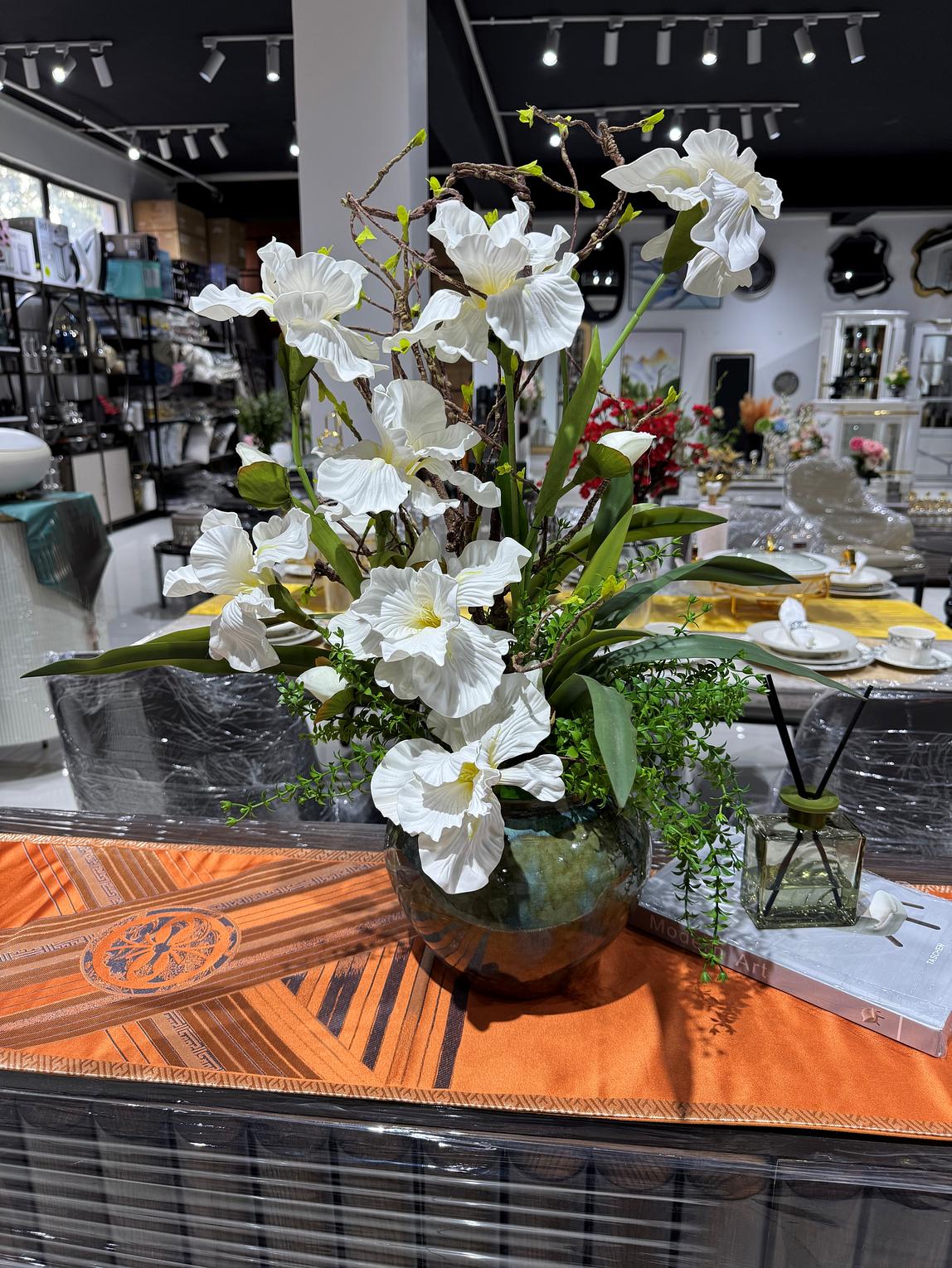 This elegant artificial white iris arrangement is a timeless statement piece designed to elevate any interior space. Featuring delicately ruffled white blooms with soft yellow centers, complemented by realistic green leaves and natural-looking branches, it beautifully captures the grace and sophistication of fresh irises, without the upkeep.