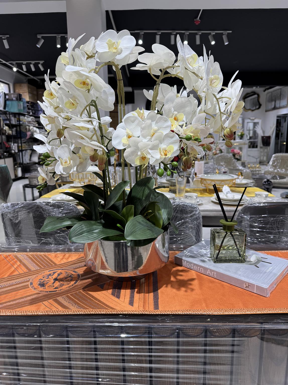 Elevate your space with this elegant White Orchid arrangement, designed to bring timeless beauty and sophistication into any interior. Featuring delicate butterfly-shaped blooms with soft yellow centers and lush green leaves, this statement piece adds a refined, modern touch to your decor.