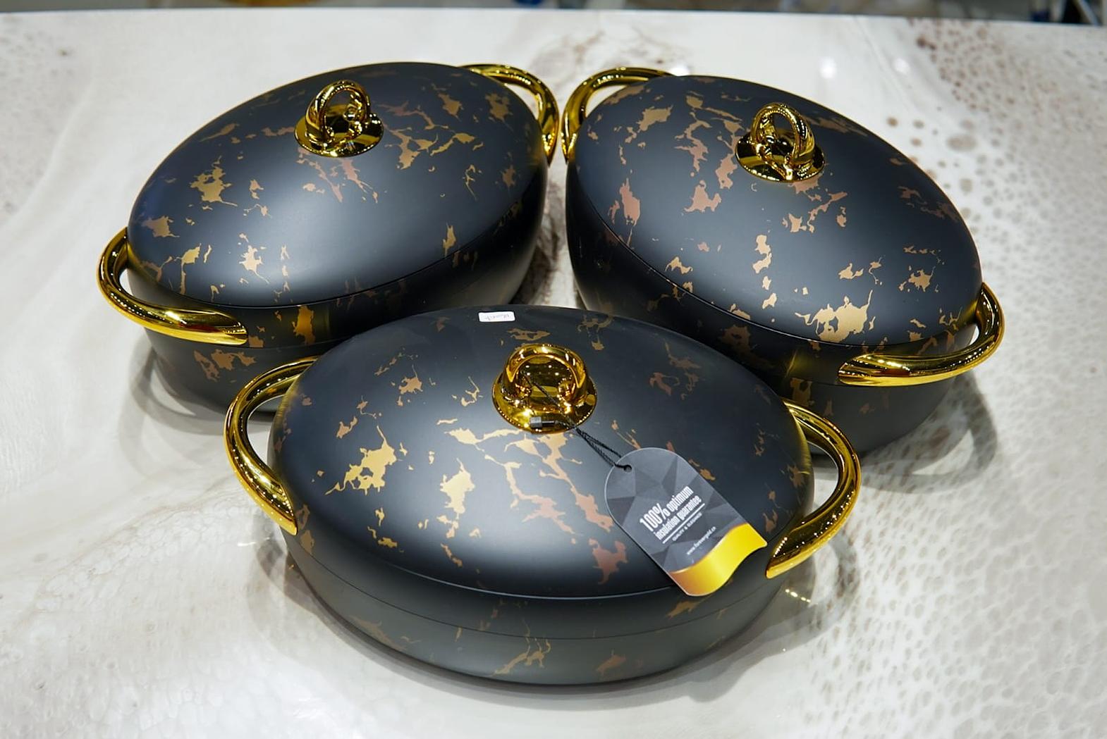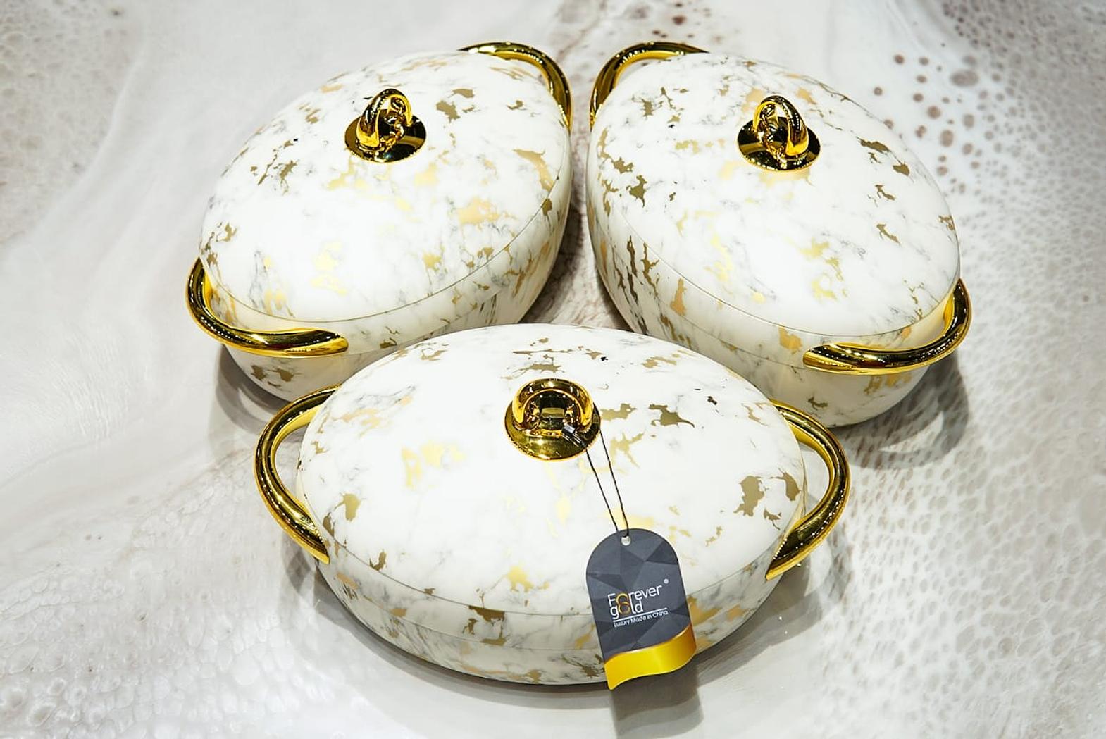 Serve your meals with sophistication using this 3-piece Oval Luxurious Forever Gold Marble Insulated Hotpot set. Designed for both style and functionality, each hotpot—available in 2L, 2.5L, and 3L capacities—retains heat for hours, keeping your dishes warm and ready to enjoy. Crafted with a sleek gold marble finish, these hotpots add a touch of elegance to any dining table while offering durability and premium quality. Perfect for soups, stews, and other hot dishes, this set combines practicality with luxury, making it an essential addition for anyone who values both presentation and performance.