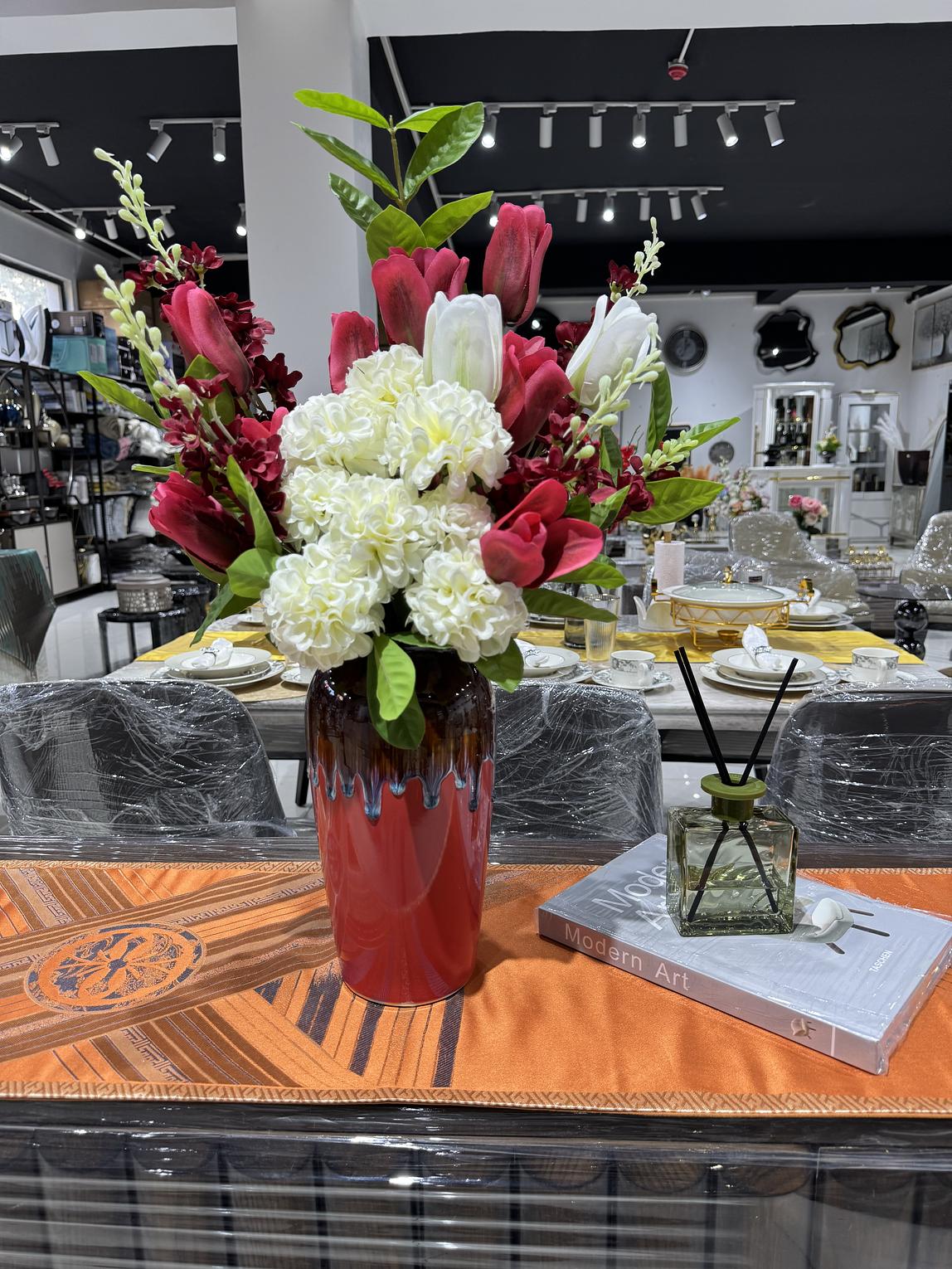 Add timeless beauty to your space with this stunning floral arrangement featuring vibrant red and white tulips paired with full, soft white hydrangeas. Designed with lush green foliage and set in a stylish decorative vase, this arrangement brings a touch of sophistication and warmth to any room, Perfect for Living room centerpieces, Dining table decor,Dining table decor, Gifts for special occasions, Home and event decoration.